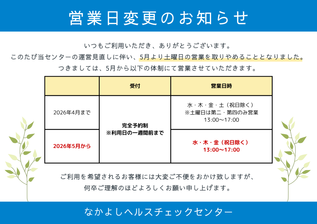 なかよしヘルスチェックセンター営業日変更のお知らせ 2026.04.20 最終更新日時 : 2026.04.20 IMS 平素はご愛顧いただきありがとうございます。 誠に勝手ながら5月より営業日を変更させていただくこととなりました。 詳細につきましては、下記をご参照ください。 なかよしヘルスチェックセンター ご迷惑をお掛け致しますが、何卒よろしくお願いします。